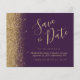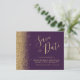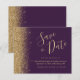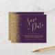 Diese elegante Save the Date preisgünstige Karte besticht durch einen goldenen Imitat-Glitzer entlang der links Kante. Der anpassbare Text kombiniert goldfarbene whimsical Handschriftenschrift, Copperplate und kursiv Schriftart auf einem dunklen lila Hintergrund. Auf der Rückseite ist ein lila und goldener Glitzer in einem passenden Design.