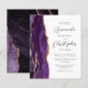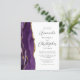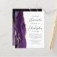 Der links Rand dieser eleganten, modernen Hochzeitseinladung zeichnet sich durch eine lila Aquarellgrenze aus, die mit Imitaten mit goldenem Glitzer bestickt wurde. Der anpassbare Text kombiniert goldfarbenes Skript und sans Serif-Schriftart auf weißem Hintergrund. Auf der Rückseite ist ein lila und goldenes Design zu sehen.