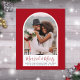 Carte de vacances minimaliste et élégante pour mariage pour les jeunes mariés avec votre photo dans un cadre d'image voûté contre un arrière - plan rouge foncé. Vous pouvez personnaliser l'accueil "Marié & Joyeux" dans un script moderne tendance rouge et votre salutation de vacances, les noms et l'année en simple typographie.