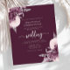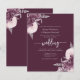 This elegant wedding invitation features mauve floral bouquets set off with silver faux foil greenery in two corners, on a deep mauve purple background. The customizable text combines silver gray serif, italic and handwriting fonts. The floral design is repeated on the reverse side.