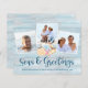 Envoyez les voeux de Noël chaleureux de la plage avec cette carte de vacances côtière personnalisée avec 3 photos et "Seas & Greutages" en typographie manuscrite. Au centre se trouve un groupe de coquillages aquarelles, avec un arrière - plan en bois de plage. Ces cartes budgétaires sont faites à partir d'un papier plus délicat, plus petit et plus léger, économisant de l'argent et des arbres. *Si vous avez besoin d'aide pour ce design ou les produits correspondants, veuillez me contacter par Zazzle.
