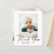 Budget Minimal Script Foto Baby Danke Karte. Auf der Rückseite befinden sich eine Familienbotschaft und ein zweites Foto. Klicken Sie auf die Schaltfläche Bearbeiten, um dieses Design mit Ihren Fotos und Details anzupassen.