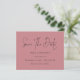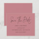Budget Minimalistisches Skript Dusty Rose Save the Date. Ein Preis SMALLER 4,5" x 5,6" Alternative. Erhältlich in einem SEMI-GLOSS 110 lb CARD STOCK, der die Standardoption (dicker für Einladungen) ist, ODER einem SATIN FINISH 80 lb THINNER PAPER STOCK (ideal für Gehäuse). Umschläge sind optional und etwas größer als die Kartengröße. Einfache Eleganz mit Save the Date in einem modernen Set-Skript.Die Erholung des Textes können Sie leicht personalisieren.Hier in schwarz auf Dusty-Rose dargestellt, aber die Text- und Hintergrundfarben können geändert werden, wenn Sie möchten über die weitere Option anpassen.