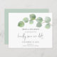 Modernes Eukalyptus-Skript Save the Date. Ein Preis SMALLER 4,5" x 5,6" Alternative. Erhältlich in einem SEMI-GLOSS 110 lb CARD STOCK, der die Standardoption (dicker für Einladungen) ist, ODER einem SATIN FINISH 80 lb THINNER PAPER STOCK (ideal für Gehäuse). Umschläge sind optional und etwas größer als die Kartengröße. Ein minimalistisches Design, um Ihre Gäste zu einem rett Ihres Datums einzuladen. Herzlich Gerettet Unser Datum ist in einem modernen Set-Skript.Die Erholung des Textes können Sie leicht personalisieren. Text- und Hintergrundfarben können geändert werden, wenn Sie über die Option Weitere Einstellungen wünschen.