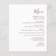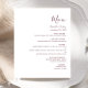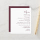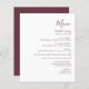 Ce menu mariage simple et moderne est composé d'un texte bordeaux sur un arrière - plan blanc. Le mot "Menu" apparaît en calligraphie manuscrite stylisée. Ajoutez le nom du couple et la date du mariage dans le script et l'italique, ainsi que les détails du menu dans la police sans serif. L'envers est assorti d'une teinte bordeaux solide.