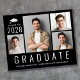 Eine preisgünstige minimale, moderne Ankündigung des Schwarzen Abschlusses mit einer 4-Foto-Collage, "Graduate" in großen weißen Buchstaben und seinem Klassenjahr, seinem Namen und seiner Schule oder Universität in schlichter weißer Typografie.