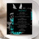 Ce menu mariage élégant et sobre présente un bouquet luxuriant et romantique à fleurs en bleu turquoise avec fausse feuille argent et feuillage de parties scintillant sur un arrière - plan noir. Customisez le texte gris argenté dans des polices stylisées sur un rectangle noir. Le dos de la carte est noir.