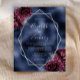 Diese elegante, moderne Hochzeitseinladung besticht durch einen silbernen geometrischen Rahmen, der mit bordeauxroten und silberfarbenen Blumenbouquets auf einem seeblauen Imitat-Hintergrund dekoriert ist. Der anpassbare Text kombiniert silbergraue, weißliche Handschrift, Kupferplatte und kursiven Schriftart.