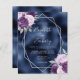 Diese elegante, moderne Hochzeitseinladung besticht durch einen silbernen geometrischen Rahmen, der mit lila, lila und silberfarbenen Blumenbouquets auf einer Folie aus marineblauen Imitaten dekoriert ist. Der anpassbare Text kombiniert silbergraue, weißliche Handschrift, Kupferplatte und kursiven Schriftart.