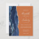 Der links Rand dieser eleganten, modernen Hochzeitseinladung besticht durch eine marineblau-blaue Aquarellgrenze, die mit Imitaten aus silberem Glitzer bestickt ist. Der anpassbare Text kombiniert Handschrift, Copperplate und kursiv Schriftart in hellsilbergrauer Farbe auf orangefarbenem Hintergrund. Die Rückseite bietet Platz für Hochzeitsdetails auf einem soliden orangefarbenen Hintergrund, zusammen mit einem QR-Code, den die Gäste scannen können, um Ihre Website und UAWG zu besuchen, was die Kosten für Druck und Versand separate UAWG rette