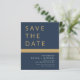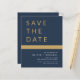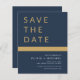 Budget Hochzeit Elegant Navy Blue und Gold speichern Sie die Datumskarten. Die Save the Date-Karten enthalten eine moderne, handgeschriebene, kursive Schriftzeichen-Typografie, die elegant, einfach und modern nach einem einfachen Hochzeitstag-Fest zu verwenden sind.