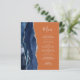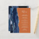 Die links Seite dieses eleganten, modernen Hochzeitsmenüs besticht durch eine marineblau-blaue Aquarellgrenze, die mit Imitaten aus silberfarbenem Glitzer besticht. Der anpassbare Text kombiniert Handschrift und Kupferplatte in silbergrau auf einem verbrannten orangefarbenen Hintergrund. Auf der Rückseite ist ein passendes marineblau-silberfarbenes Design erkennbar.