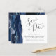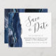 Diese elegante Budget Save the Date Karte verfügt über eine marineblau Aquarellgrenze mit Imitaten silbernen Glitzer beschnitten. Der anpassbare Text kombiniert handgeschriebene handgeschriebene handgeschriebene handgeschriebene Schriften aus Holzkohle, Copperplate und kursiv auf weißem Hintergrund. Auf der Rückseite ist ein passendes marineblau-silberfarbenes Design erkennbar.