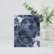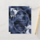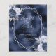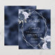 Diese elegante, moderne Hochzeitseinladung besticht durch einen silbernen geometrischen Rahmen, der mit staubblauen, marineblau und silberblauen Blumenbouquets auf einer Folie aus marinebasierblauem Imitat verziert ist. Der anpassbare Text kombiniert silbergraue, weißliche Handschrift, Kupferplatte und kursiven Schriftart.