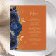 Die links Seite dieses eleganten, modernen Hochzeitsmenüs besticht durch einen blumenblauen Marinebouquet, der mit vergoldeten Imitate-Folien-Blätter besticht und mit vergoldetem Imitat-Glitzer bestreut ist. Der anpassbare Text kombiniert blassgoldfarbene Handschriftenschrift, Copperplate und kursiv Schriftart auf einem verbrannten orangen Hintergrund. Die Rückseite weist ein passendes Blumendesign auf.