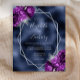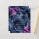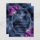 Diese elegante, moderne Hochzeitseinladung besticht durch einen silbernen geometrischen Rahmen, der mit lila und silberfarbenen Blumenbouquets auf dem Hintergrund der Imitate in Marineblau dekoriert ist. Der anpassbare Text kombiniert silbergraue, weißliche Handschrift, Kupferplatte und kursiven Schriftart.