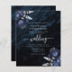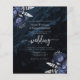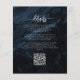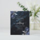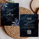 This elegant wedding invitation features navy blue floral bouquets set off with silver faux foil greenery in two corners, on a background image of navy blue watercolor agate. The customizable silver gray text combines serif, italic and handwriting fonts. The reverse side provides space for wedding details, along with a QR code guests can scan to visit your website and RSVP.