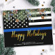 Envoyez des voeux de Noël Joyeux à vos amis, votre famille, vos collègues services de police et votre communauté avec cette carte de Noël Joyeuse Police de Ligne Bleue - American Flag aux couleurs du drapeau de la police, noir et bleu moderne avec des feuilles saints et des baies et élégant script d'or. Personnalisez avec votre message et nom de famille ou service de police. Ces cartes de Noël de la police sont parfaites pour les familles policières et policières ainsi que pour les services de police. DROIT D'AUTEUR © 2020 Judy Burrows, Black Dog Art - Tous droits réservés. Budget Police Cartes de Noël Application de la loi
