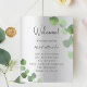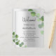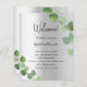 Un programme de mariage moderne, élégant, chronologie. Arrière - plan de couleur argent faux, décoré de verdure d'eucalyptus, sprigs. Personnalisez et ajoutez vos noms et les détails du mariage. Lettres de couleur noire. Si vous avez plus de texte, il est possible de réduire l'espace de ligne et d'ajouter du texte au dos.