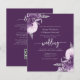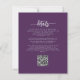 This elegant wedding invitation features purple and lilac floral bouquets set off with silver faux foil greenery in two corners, on a purple background. The customizable text combines silver gray serif, italic and handwriting fonts. The reverse side provides space for wedding details, along with a QR code guests can scan to visit your website and RSVP.