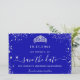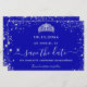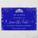 Eine gmädchenhafte und trendige Save the Date-Karte für eine Quinceañera, 15. Geburtstagsfeier. Ein königsblauer Hintergrund. Dekoriert mit Imitaten silbernen Glitzer Staub und ein Tiara, Krone. Der Text: Save the Date ist mit einem großen angesagten, handgeschriebenen Stilskript geschrieben.