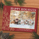 Mit dieser stilvollen Budget Holiday Card senden Sie Frohe Festtage an Familie und Freunde. Es ist mit goldfarbenem, handgezapftes Blattwerk und Beeren auf bordeauxrot dekoriert. Einfach mit Foto und Namen anpassbar. Weil wir unsere eigenen Kunstwerke erstellen, werden Sie dieses exakte Bild von anderen Designern nicht finden. Original Zeichnend © Michele Davies.