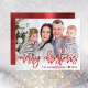 Freuen Sie sich auf eine unserer personalisierten Weihnachtskarten für das Foto. Dieses moderne Design zeigt Ihr Foto mit einem Overlay unten und Gruß in rotem Skript, das "Frohe Weihnachten" mit Ihrem Namen und Jahr, um sich anzupassen. Die Rückseite der Karte hat eine glänzende, rote Metallic-Textur in den Imitaten. Entworfen von der Künstlerin Susan Coffey.