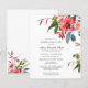 Farbenfrohe Rot, Korallenrosa, gelbe Wildblumen sind von einer Vielzahl an Grünpflanzen umgeben. Die Blätter und Weinreben sind dunkeloliv, marineblau und weich rot. Offen, luftig und sehr rustikal Bohemisch.