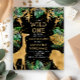 Die Babydusche zum Thema "Wilder-Dschungel-Safari" lädt mit goldenen Imitaten (Giraffen, Löwen und Affen), goldenem und grünem Dschungelblättern und einer Sprinklerei Goldkonfetti auf schwarzem Hintergrund zum Verweilen ein. Fügen Sie den Namen der Mutter-zu-sein und Dusche Details in weiß und gold Text. Die Rückseite der Karte wird durch ein koordinierendes Dschungelfolienmuster in Grün und Gold auf schwarzem Hintergrund verziert.