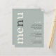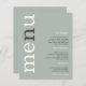 Un rapport qualité-prix BUDGET alternative sur une taille plus petite 4,5 x 5,6" semi-brillant poids 110lbs, qui est d'une épaisseur similaire à une carte postale (cependant ne convient pas à l'utilisation comme carte postale.) VEUILLEZ NOTER qu'il y a UN par feuille. Menu Mariage Texte ivoire Simple Sage. Un design typographique moderne avec Menu en grande typographie en ivoire avec le "n" en gris, tourné et à gauche sur un arrière - plan de vert sauge clair. Les couleurs Arrière - plans et textuelles peuvent être modifiées si vous le souhaitez via Personnaliser.