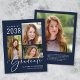 Eine preisgünstige Ankündigung des blauen Abschlusses mit einer 3-Foto-Collage und "Graduate" in einem eleganten weißen Drehbuch. Fügen Sie den Namen, das Klassenjahr und die Schule oder Universität in der einfachen modernen weißen Typografie. Fügen Sie auf der Rückseite ein zusätzliches Foto und Ihre personalisierte Nachricht hinzu. Dieses halbglänzende Haushaltspapier ist gewichtsähnlich wie Foto. Es ist auch eine größere 12x18-Kartenversion verfügbar (für den Link die Meldung).