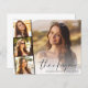 Moderner budgetfreundlicher Abschluss danken Ihnen mit dem Foto des Absolventen überlagert mit einem Streifen von drei kleineren quadratischen Fotos, "danke" in einem stilvollen Drehbuch, und ihren Namen, Schule und Klasse Jahr in der einfachen Typografie. Auf der Rückseite passen Sie eine Dankeschön-Nachricht an und fügen den Namen des Absolventen in ein signaturähnliches Skript ein.