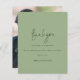 Script Photo Sage Merci Mariage vert. Un prix économique PETIT 4,5 po x 5,6 po alternatif. Disponible dans un STOCK SEMI-GLOSS 110 lb CARD qui est l'option par défaut (plus épais pour les invitations), OU un STOCK SATIN FINISH 80 lb THINNER PAPER (idéal pour les boîtiers). Les enveloppes sont en option et légèrement plus grandes que la taille de la carte. Un design minimaliste de typographie avec un ensemble de style design d'écriture manuscrite pour le Merci. Sur le dos, remplacez l'exemple de photo par votre préféré de la journée comme souvenir pour vos invités. Personnalisez facilement le reste du texte avec votre message et vos noms.