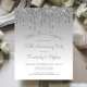 This trendy 25th wedding anniversary surprise party invitation features a sparkly silver faux glitter drip border and silver ombre background. The words "Shhh! It's a Surprise," "25th Anniversary Party" and the first names of the couple appear in casual silver gray handwriting script, with the rest of the customizable text in sans serif font. The same silver glitter drip design appears on the reverse side.