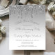 This trendy 25th wedding anniversary surprise party invitation features a sparkly silver faux glitter drip border and silver ombre background. The words "Shhh! It's a Surprise," "25th Anniversary Party" and the names of the couple appear in casual silver gray handwriting script, with the rest of the customizable text in sans serif font. The same silver glitter drip design appears on the reverse side.