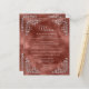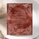 Dieses Vintag inspirierte Hochzeitsmenü bietet den Text in hellsilbergrauem Schrift und Serif-Schriftart, gerahmt von einem Vintagen Silberfolienmotiv in vier Ecken auf einem Zimtröhrenbraun. Der Rahmen und der Aquarellhintergrund werden auf der Rückseite wiederholt.