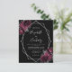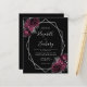Diese elegante, moderne Hochzeitseinladung besticht durch einen silbernen geometrischen Rahmen, der mit bordeauxroten und silbernen Blume auf schwarzem Hintergrund dekoriert ist. Der anpassbare Text kombiniert silbergraue, weißliche Handschrift, Kupferplatte und kursiven Schriftart. Die Rückseite ist schwarz.