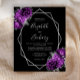 Diese elegante, moderne Hochzeitseinladung besticht durch einen silbernen geometrischen Rahmen, der mit lila und silbernen Blume auf schwarzem Hintergrund dekoriert ist. Der anpassbare Text kombiniert silbergraue, weißliche Handschrift, Kupferplatte und kursiven Schriftart. Die Rückseite ist schwarz.