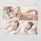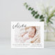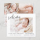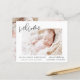 Budget Simple Baby Announcement Elegant Foto Collage, die ein Foto auf der Vorderseite und 4 Bilder auf der Rückseite haben. Die Karten enthalten eine moderne, handgeschriebene, kursive Schriftzeichen-Typografie, die elegant, einfach und modern für einen Neugeborenen oder ein Kindermädchen ist, das von der Mutter und dem Vater des Säuglings an Familie und Freunde verschickt wird.