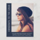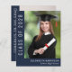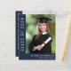 Einfache und elegante, preisfreundliche, dunkelblaue Abschluss-Ankündigung mit moderner weißer Typografie. An vorderster Front stehen das Foto des Absolventen, das Schuljahr sowie sein Name und seine Schule. Auf der anderen Seite, fügen Sie ein zusätzliches Foto, eine Botschaft der Glückwünsche und eine persönlichere Botschaft wie die Pläne des Absolventen.