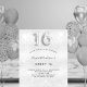 Eine moderne, stilvolle und glamouröse Einladung für eine Mädchenfeier zum 16. Geburtstag. Ein silbernes Imitat mit Glitzer-Staub. Personalisieren Sie Ihren Namen und Ihre Party-Daten und fügen Sie diese hinzu. Nummer 16 wird mit einem Schriftart im Ballonstil geschrieben, Skript.