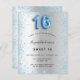 Eine moderne, stilvolle und glamouröse Einladung für eine Girl's Sweet 16, 16. Geburtstagsparty. Ein silberfarbenes Imitat mit blauen Glitzer-Staub. Personalisieren Sie Ihren Namen und Ihre Party-Daten und fügen Sie diese hinzu. Nummer 16 wird mit einem Schriftart im Ballonstil geschrieben, Skript.