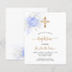 Für eine elegante Taufe, ein Baby zu feiern. Ein schick weißer Hintergrund. Die Einrichtung besteht aus hellblauen und weißen Blumen, Rose und einem vergoldeten Kreuz der Imitate. Personalisieren und fügen Sie den Namen des Kindes und die Details. Schwarze und goldene Buchstaben.