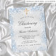 Ein modernes, elegantes Taufen, das einen kleinen Jungen feiert. Imitate silbermetallischer Hintergrund mit blauen Imitaten Glitzer Staub und ein goldenes Kreuz. Personalisieren und fügen Sie einen Namen und Party-Details hinzu. Schwarze Buchstaben.