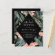 Dieses Budget Schwarz Tropical Floral Bridal Dusche Einladung dekoriert mit tropischen Blume, Palmen Blätter und Äste und eleganten weißen Text . Die Rückseite der Einladung ist schwarz.