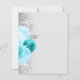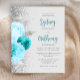 Die links Seite dieses eleganten, modernen Hochzeitseinladens besticht durch einen Blumenstrauß in türkisfarbenen und hellblauen Farbtönen, besticht durch silberne Imitate und Imitate Glitzer und besticht durch einen Glitzer aus silbernen Imitaten. Der anpassbare Text kombiniert türkisfarbenes Kalligraphieskript mit karkohlegrauem Sans-Serif-Schriftart auf einem hellsilbergrauen Hintergrund. Auf der Rückseite ist ein passendes türkisfarbenes und silberfarbenes Blumendesign.
