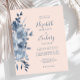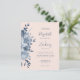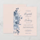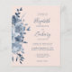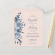 Die links Hand dieses romantischen Hochzeitsaufenthaltes besticht durch einen Blumenstrauß in Aquarelltönen mit dustigen blauen Blumen und blauen Blättern. Der anpassbare Text kombiniert Handschrift, Copperplate und kursiv Schriftart in marineblau auf einem rot-rosa Hintergrund. Die Rückseite ist eine koordinierende Feströtung.