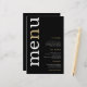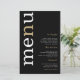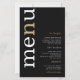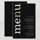 Einfache White Gold Typografy Black Wedding Menü. Ein günstiges Preis-Leistungs-Verhältnis von 5,5" x 8,5", auf einem eleganten 110 lb LINEN Stock - für ein luxuriöses Ambiente zu einem guten Preis-Leistungs-Verhältnis, perfekt für Menüs, Einladungen und Programme etc. Diese Alternative zur Budgetgröße ist auch bei anderen Papiervorschlägen verfügbar. Der SEMI-GLOSS 110 lb Kartenvorrat ist etwa so dick wie eine Postkarte, funktioniert also auch bei Einladungen gut. Das FELT 100 lbs Papier ist bufffarben, NICHT weiß, fügt also eine rustikale Touch hinzu. Die MATTE 80lbs Papier ist hell weiß, für knackigen Druck, ideal für Ihre Menüs und Programme, während das SATIN 80lbs Papier ist dünn und hell Ein modernes typografisches Design mit Menu in großer Typografie in Weiß mit dem "n" in Gold gedreht und auf der links Seite auf schwarzem Hintergrund.