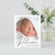 Eine budgetfreundliche, geschlechtsneutrale Geburtsankündigung für Säuglinge. Die Vorderseite zeigt das Foto Ihres Neugeborenen, den vollständigen Namen, das Ankunftsdatum und die Geburtsdaten sowie "Willkommen" in einem stilvollen Schrift. Auf der Rückseite können Sie drei zusätzliche Fotos und Eltern- und Geschwisternamen hinzufügen, und ein Dankeschön, Besuchen oder andere Nachricht.