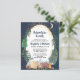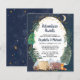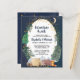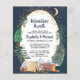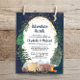 Die kleine Babydusche-Einladung eines rustikalen Ehepaares mit einer niedlichen Darstellung von Waldtieren mit ihrem Zelt-Camping in Bergen und Wäldern, einem Überlagerungsgelände von Goldstars und Mond in einem Nachthimmel und "Adventure Awaits" und den Namen des zukünftigen Eltern in einem dunkelblauen Schriftsatz von Mitternacht. Die Dusche ist einfach zu personalisieren.